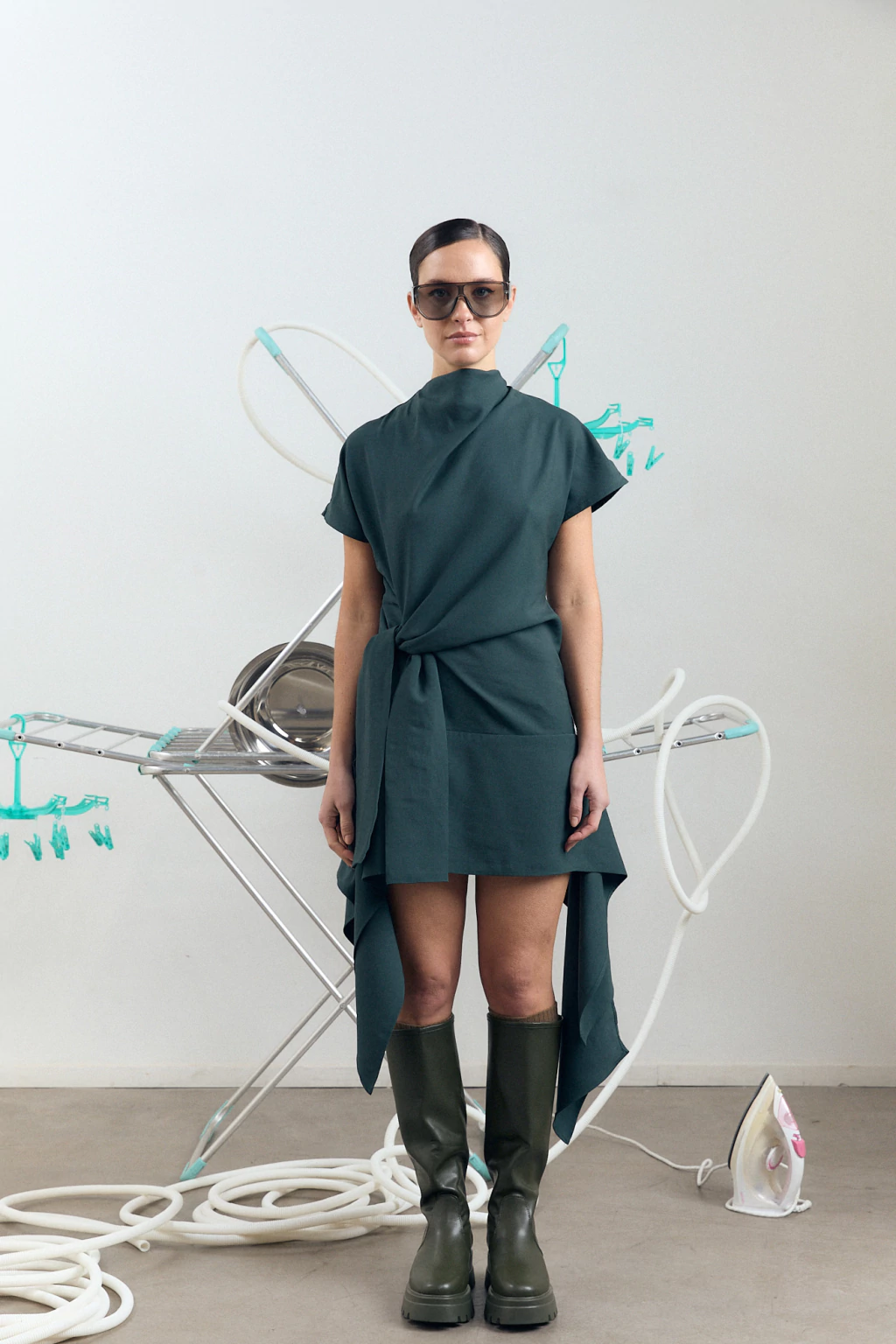Un vestido que combina estructura y movimiento con una estética contemporánea. Confeccionado en un twill liviano con cuerpo, este diseño se anuda con naturalidad en la cintura, generando un efecto de drapeado sutil que estiliza la figura. Su escote cerrado y mangas tipo kimono contrastan con el ruedo asimétrico que aporta dinamismo y actitud.